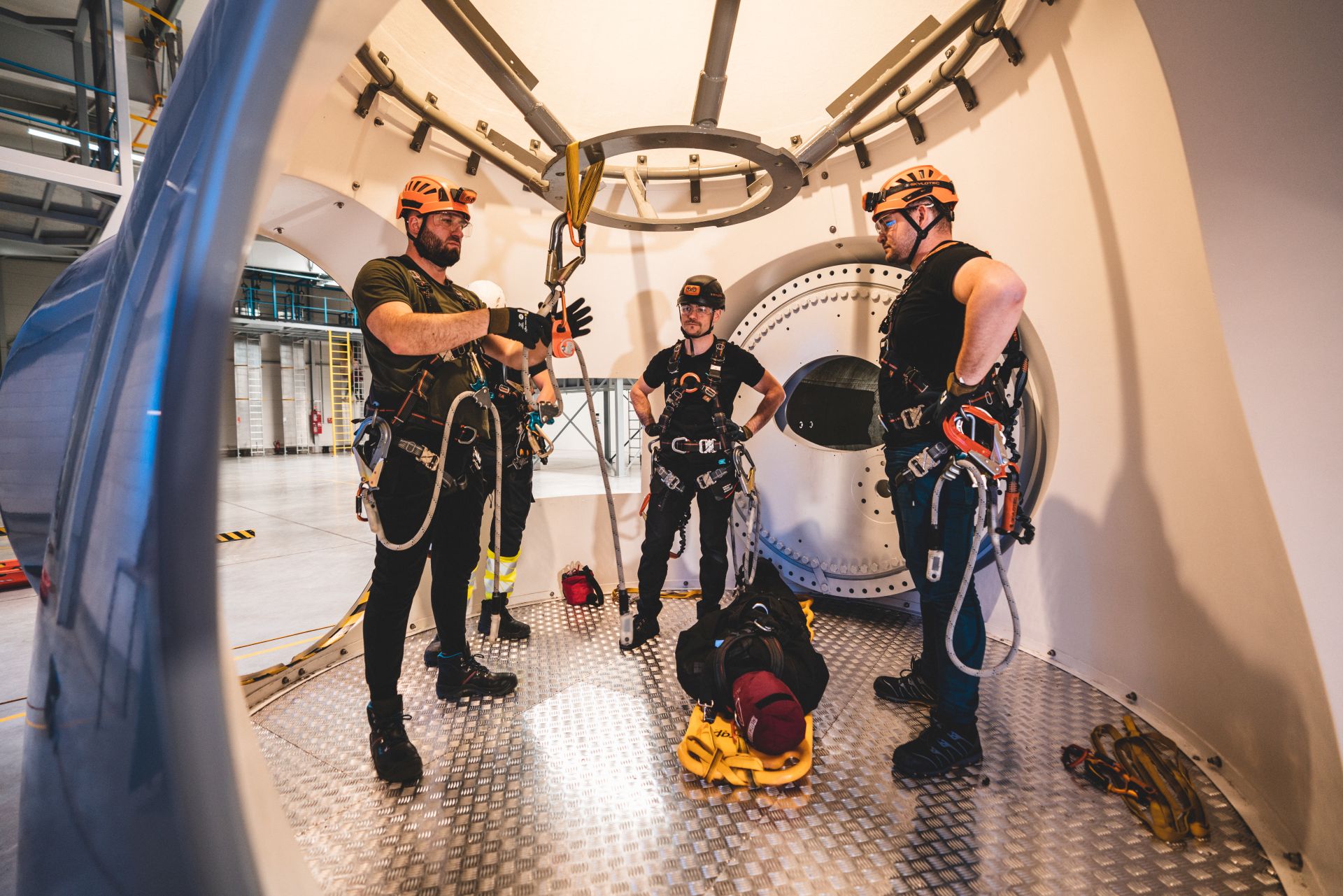 The aim of this module is to enable the participants to perform injured person rescue operations in a WTG nacelle, tower, and basement, by using industry standard rescue equipment, methods, and techniques, exceeding those of GWO work at height.